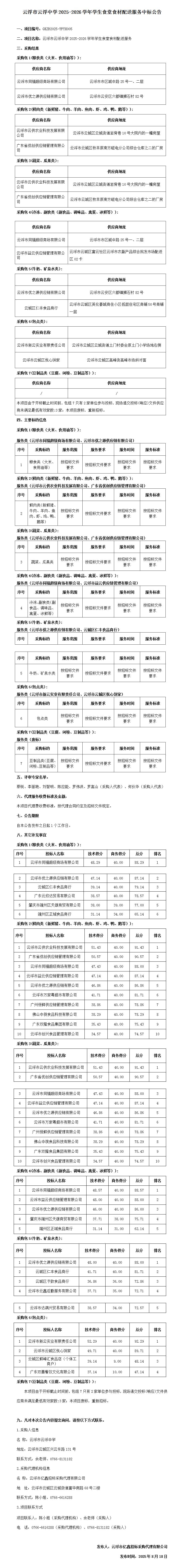云浮市云浮中學(xué)2025-2026學(xué)年學(xué)生食堂食材配送服務(wù)中標(biāo)公告